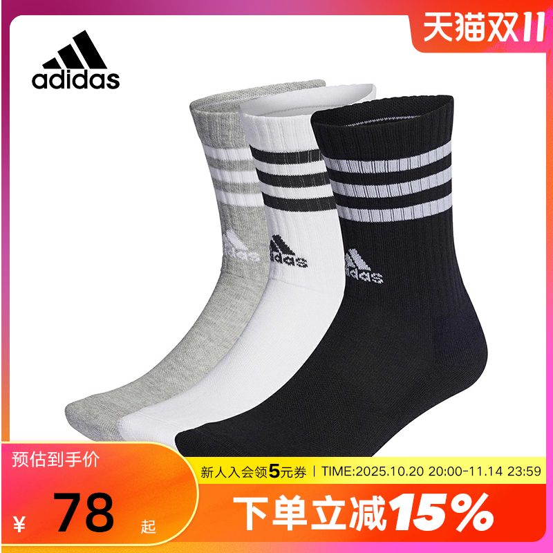 Adidas阿迪达斯三条纹中筒袜男女款袜舒适黑白灰三双装袜子IC1323