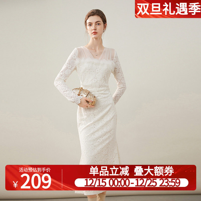 白鹿语绒面蕾丝鱼尾裙25秋款法式优雅V领长款修身曼波风连衣裙女