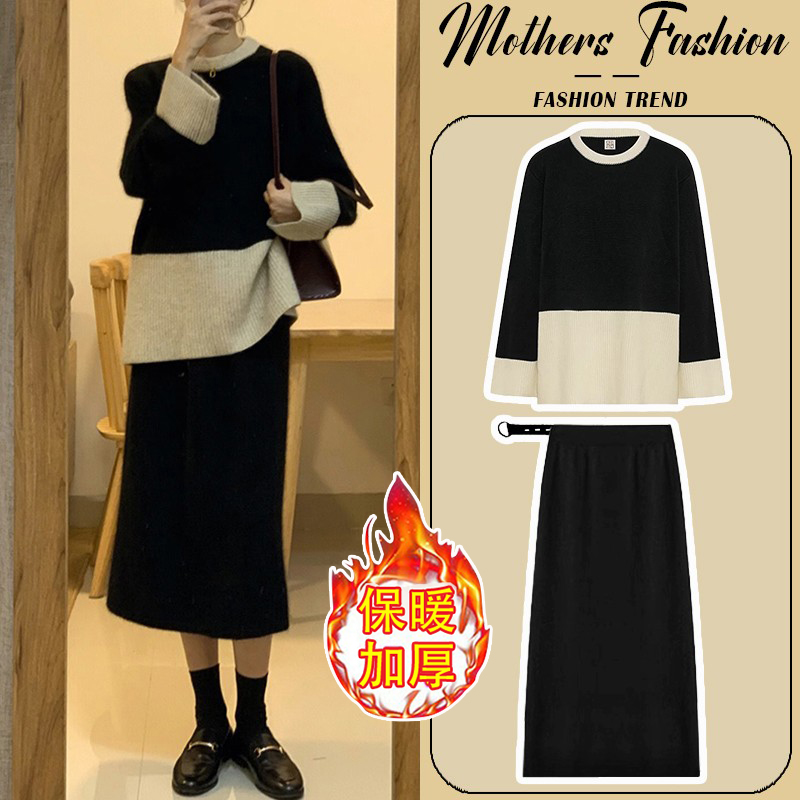 孕妇套装2025新款秋冬时尚洋气时髦黑色针织拼接毛衣半身裙两件套