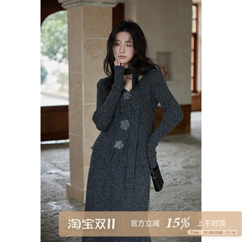 阔色灰色毛衣开衫半裙两件套装25秋冬季新款女针织衫上衣半身裙子