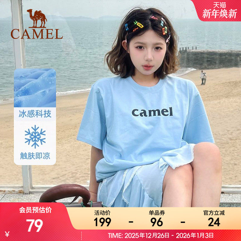 夏日骆驼T神冰感运动短袖2025新款夏圆领休闲复古宽松上衣女T恤男