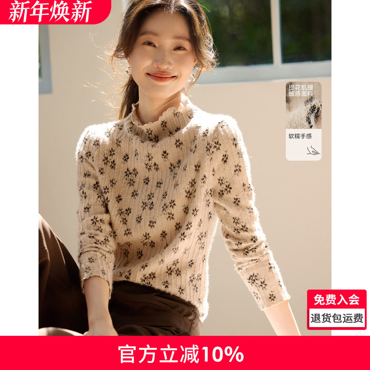 沫晗依美撞色提花肌理木耳边女T恤2025冬季新款气质显瘦打底衫女