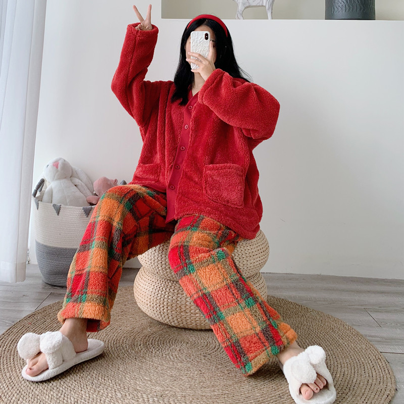 V领红色本命年加厚冬季开衫加大码法兰绒睡衣女两件套胖mm家居服