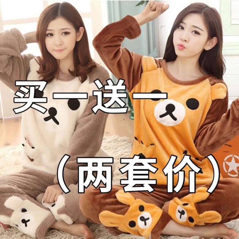 新款法兰绒睡衣女冬加厚保暖清新卡通熊收口束脚珊瑚绒家居服套装