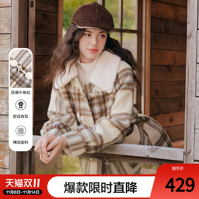betu百图毛领牛角扣格子毛呢外套女2025年冬季新款加厚呢子大衣