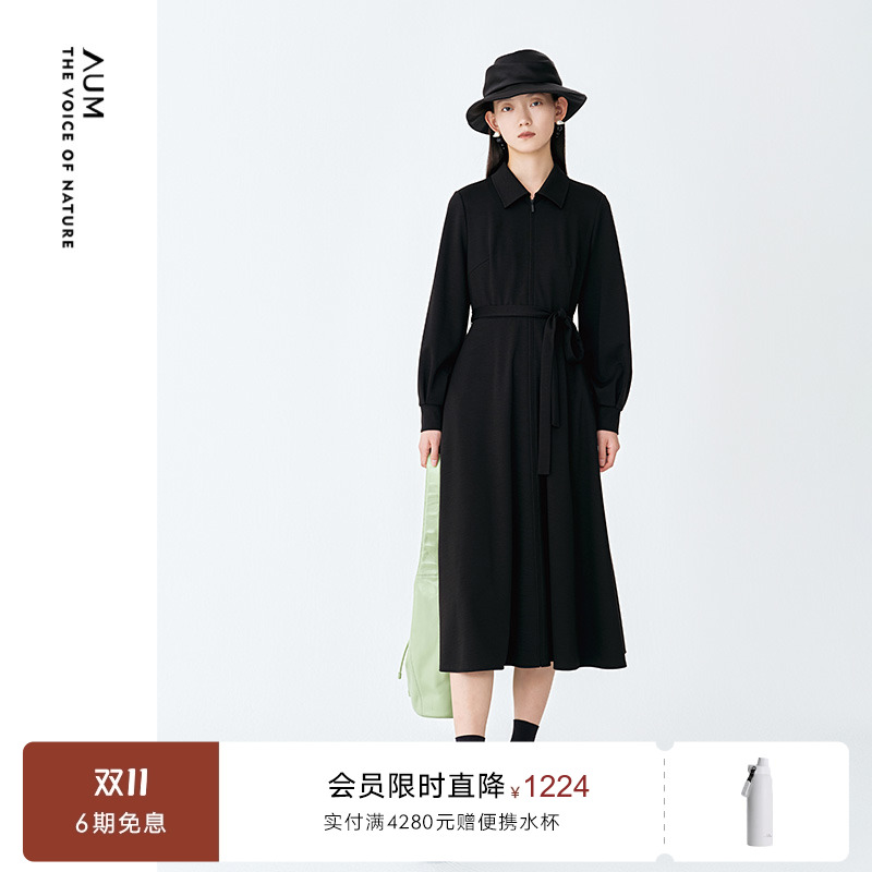 【可颂裙】AUM噢姆冬季羊毛衬衫式拉链腰带收腰黑色连衣裙长裙女