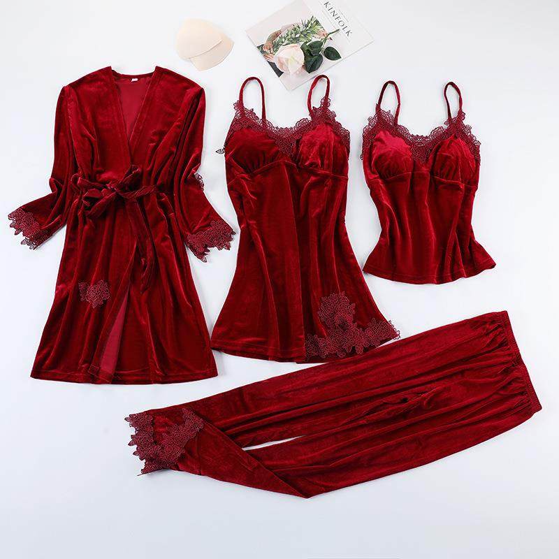 睡衣女秋冬季性感金丝绒长袖长裤两件套金钻绒蕾丝开衫套装可外穿