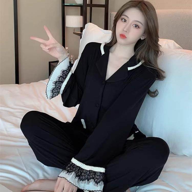 网红风睡衣女春秋季长袖长裤套装性感蕾丝花边黑色2026新款家居服