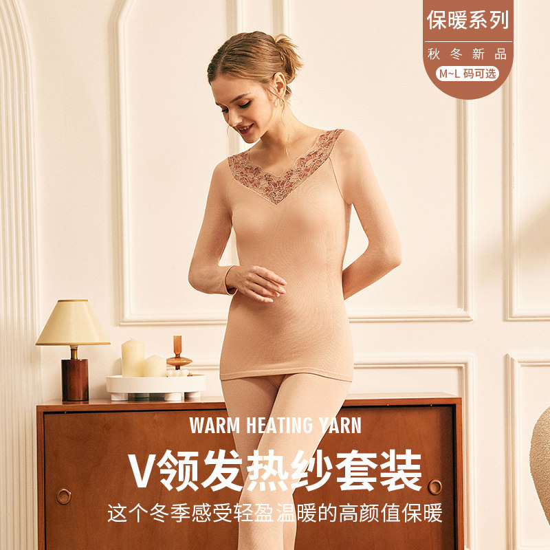 秋冬保暖内衣女长袖长裤套装性感蕾丝V领无痕修身打底衫美奈花园
