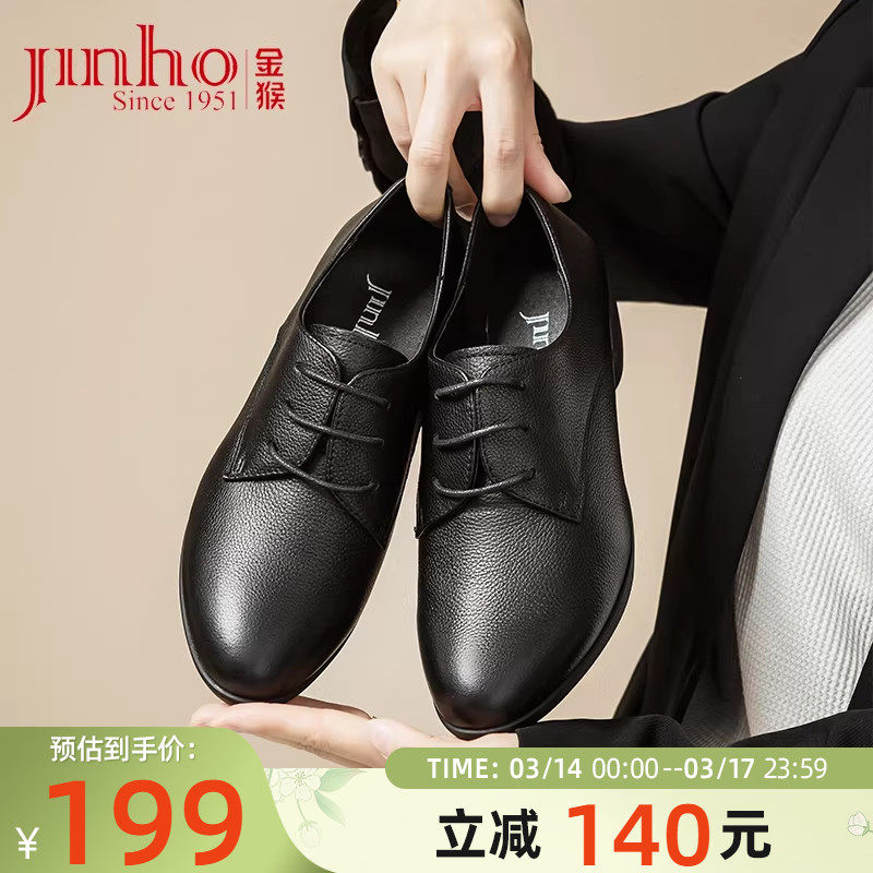 金猴尖头深口单鞋女鞋春季女士工作鞋系带小皮鞋女通勤真皮高跟鞋