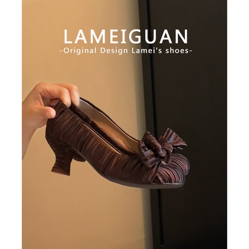 复古咖色褶皱蝴蝶结圆头高跟鞋女2026春季新款浅口粗跟单鞋不累脚