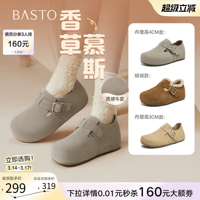 【香草慕斯】百思图26春商场新款真皮厚底灰色勃肯鞋单鞋内增高女