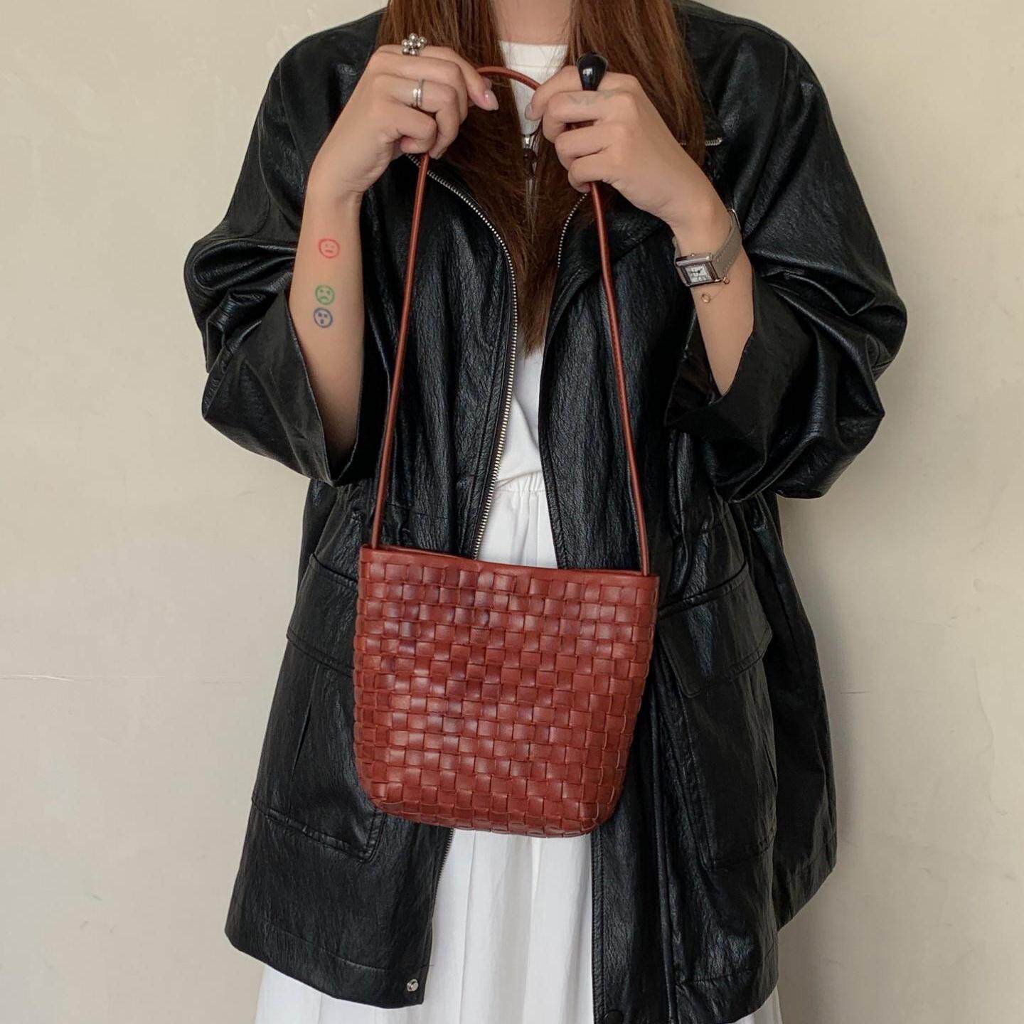 水洗擦色手工编织顿顿包植鞣牛皮斜挎包女单肩包高级感百搭马蹄包
