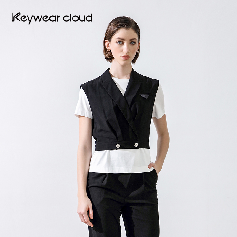 Keywearcloud奇威夏季短款简约百搭精致纽扣外穿黑色西装领马甲