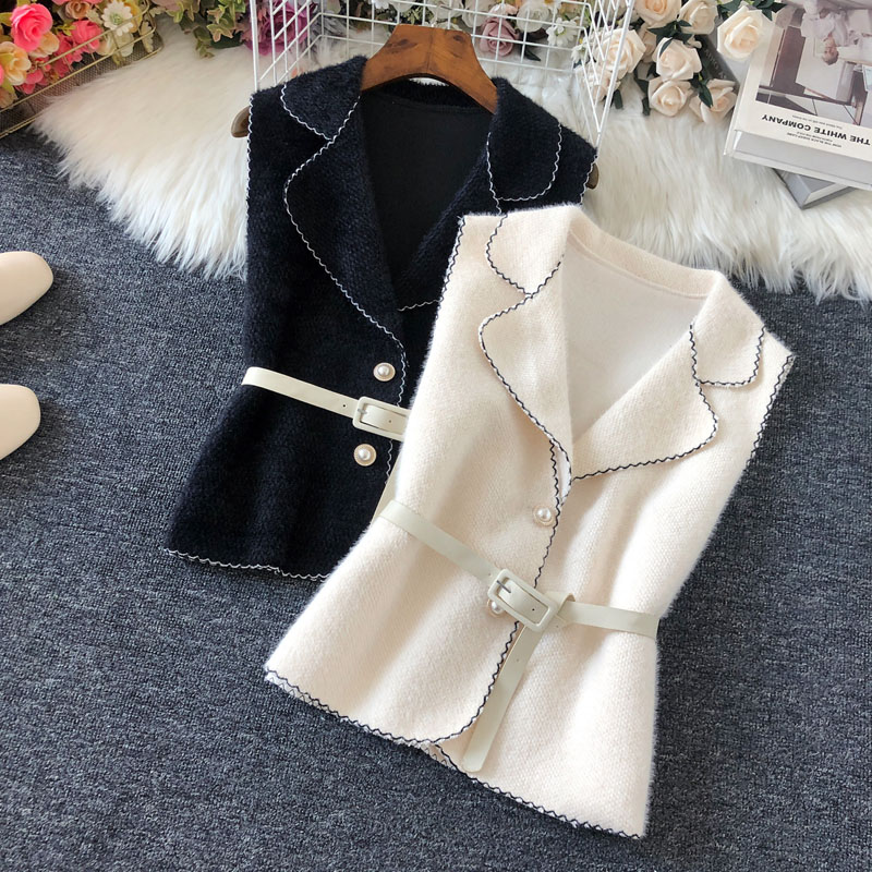 时尚小香风仿水貂毛西装领马甲女春季新款时髦坎肩针织衫叠穿套装