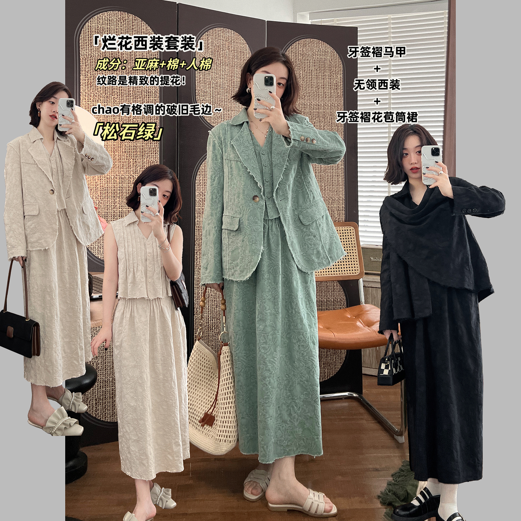 【花间拾梦】暗纹提花亚麻西装无领披肩领牙签褶衬衫领马甲花半裙