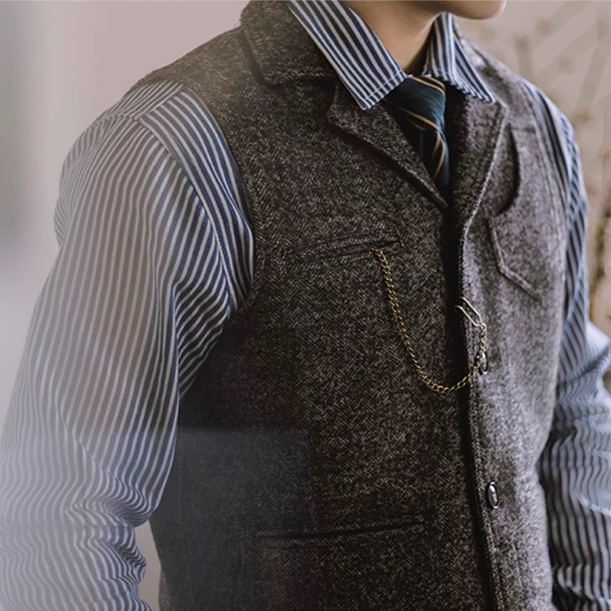 春秋季英伦复古风羊毛人字纹修身西装领马甲绅士粗花呢马夹坎肩男