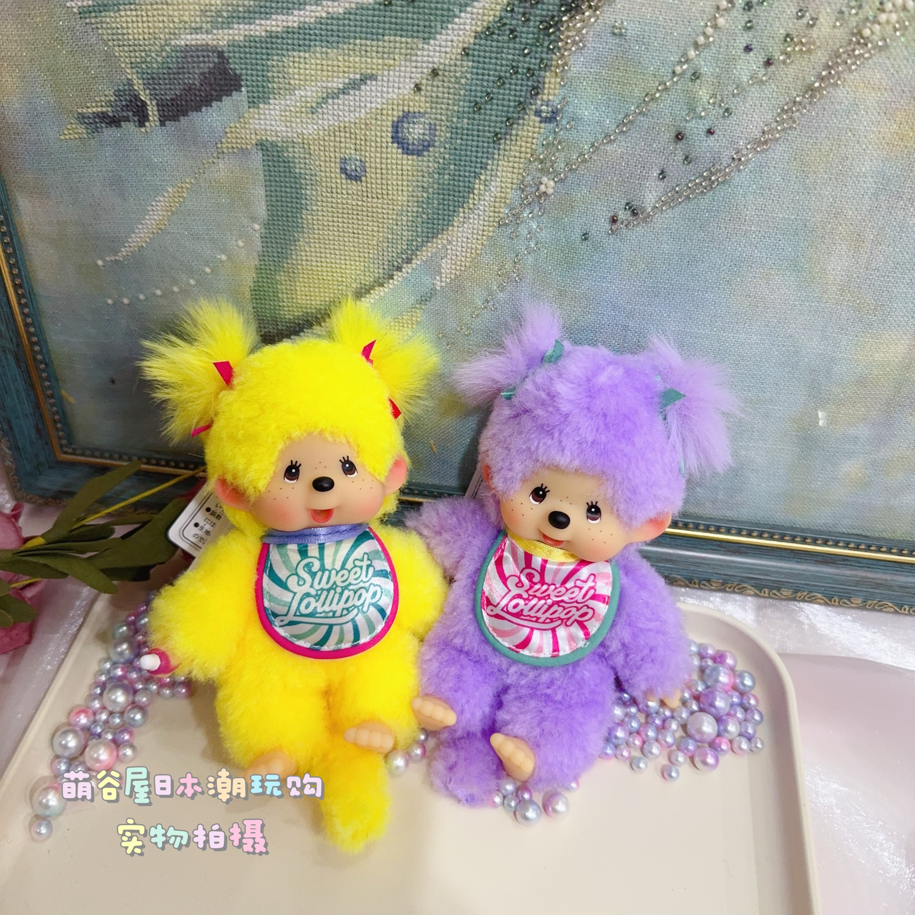 现货日本正品蒙奇奇monchhichi棒棒糖毛绒黄色紫色卷毛挂件钥匙扣