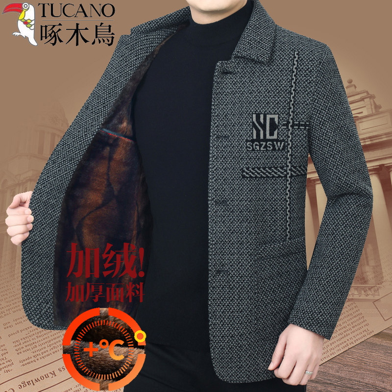 啄木鸟中老年男士翻领加绒加厚保暖休闲爸爸夹克外套毛呢大衣男装