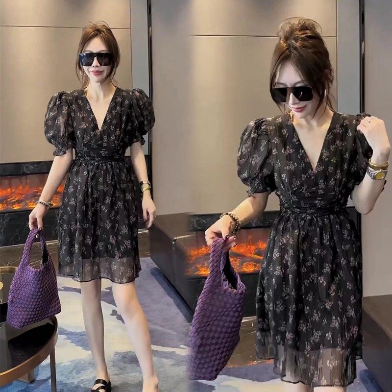2025夏季新款韩版时尚泡泡短袖雪纺V领碎花连衣裙女收腰洋气显瘦