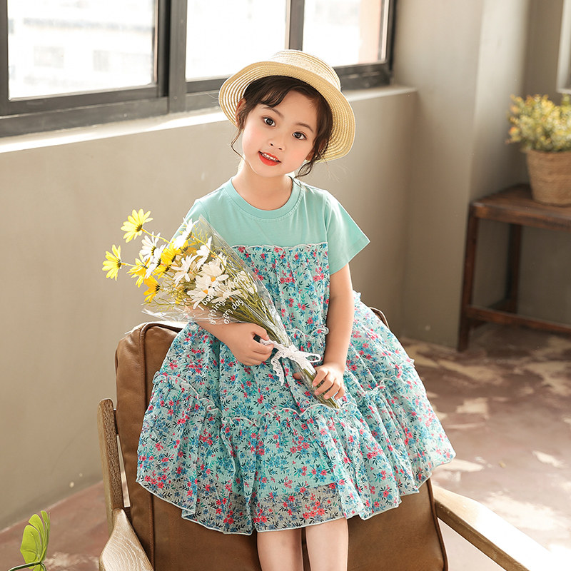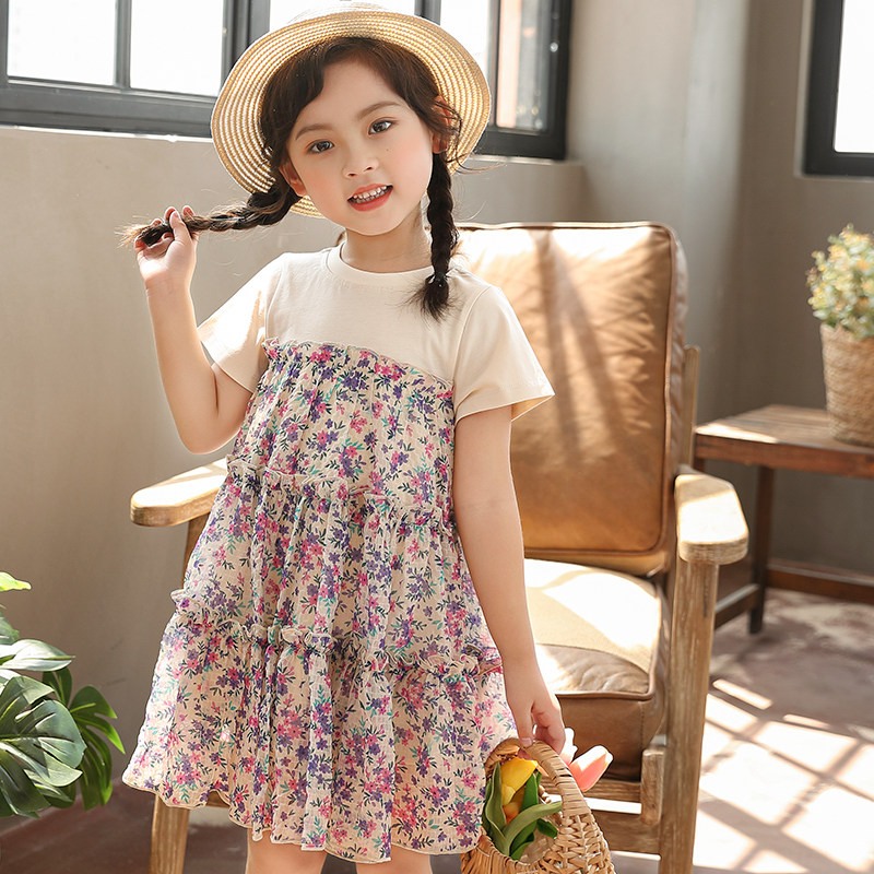 女童2025夏季新款韩版纯棉中大童洋气碎花短袖夏款雪纺拼接连衣裙