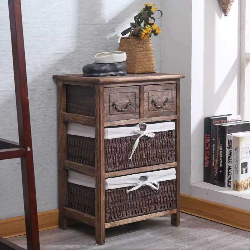 美式复古藤编收纳柜实木斗柜w夹缝抽屉柜储物柜床头柜边角柜置物