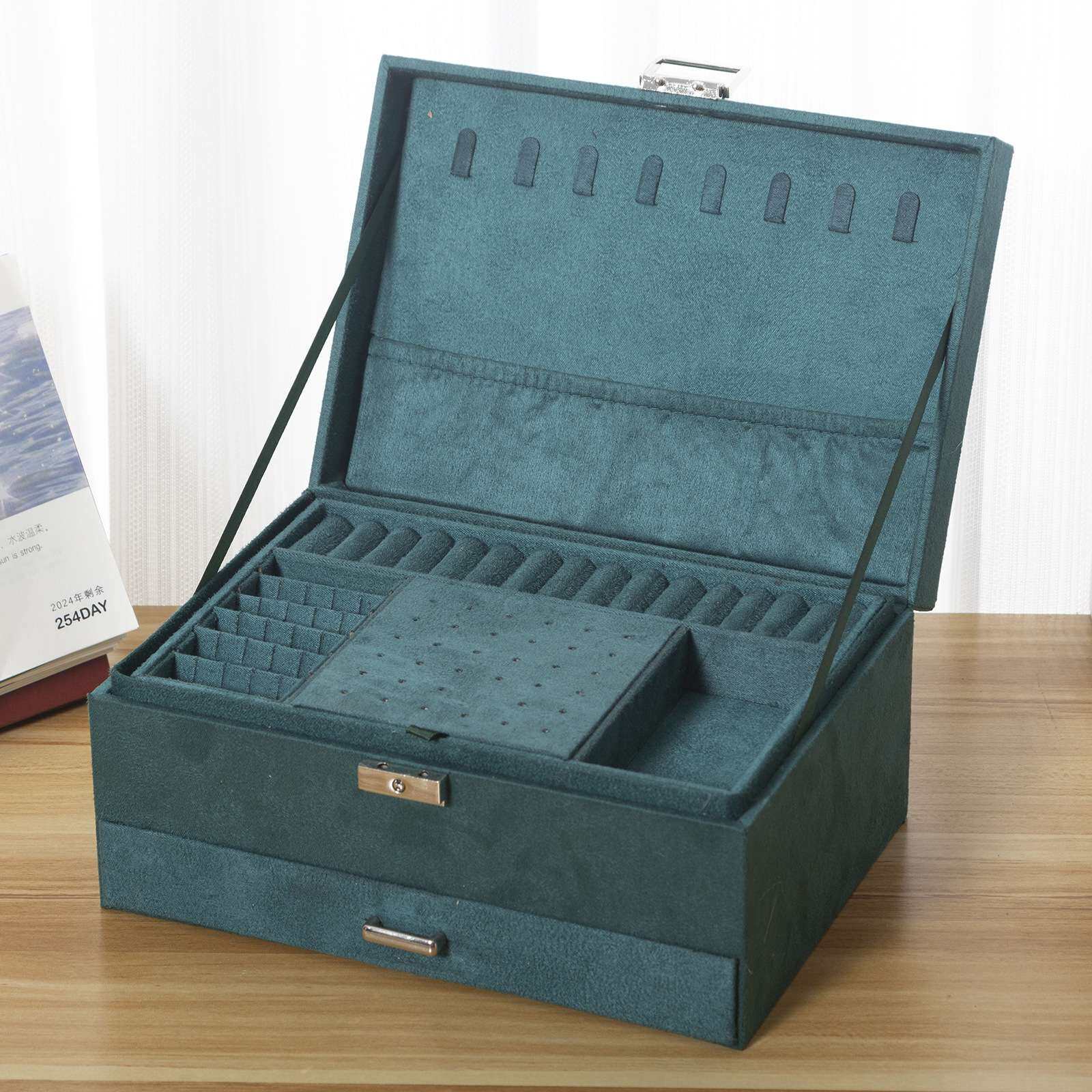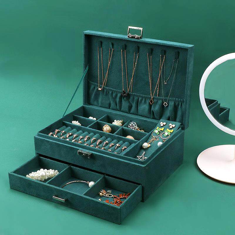 墨绿色三层带锁绒布首饰盒手饰品首饰收纳盒女公主欧式高档饰品盒