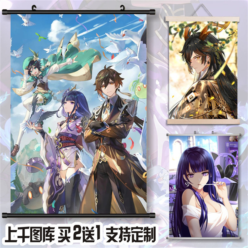 原神刻晴钟离达达利亚动漫挂画客厅装饰画diy二次元布艺卷轴画一
