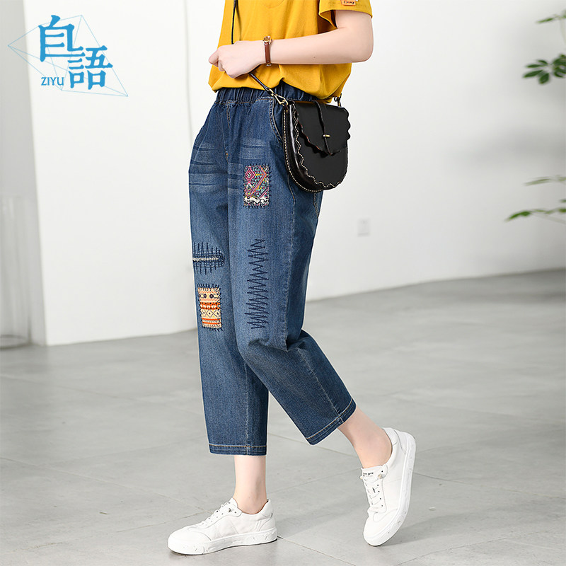 自语高腰浅色简约宽松休闲牛仔哈伦裤显瘦复古撞色线老爹裤九分裤
