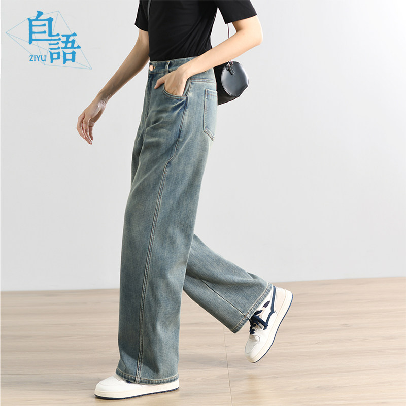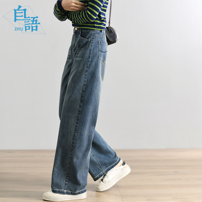 自语22秋新款直筒水洗复古牛仔长裤高腰显瘦阔腿加长拖地休闲裤女
