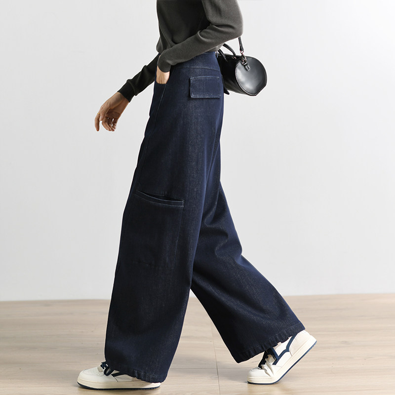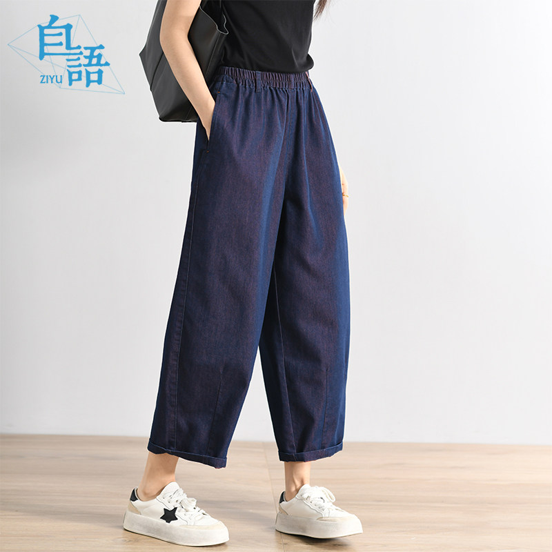 自语24春新品宽松休闲简约百搭深蓝松紧腰廓形显瘦气球裤牛仔裤女