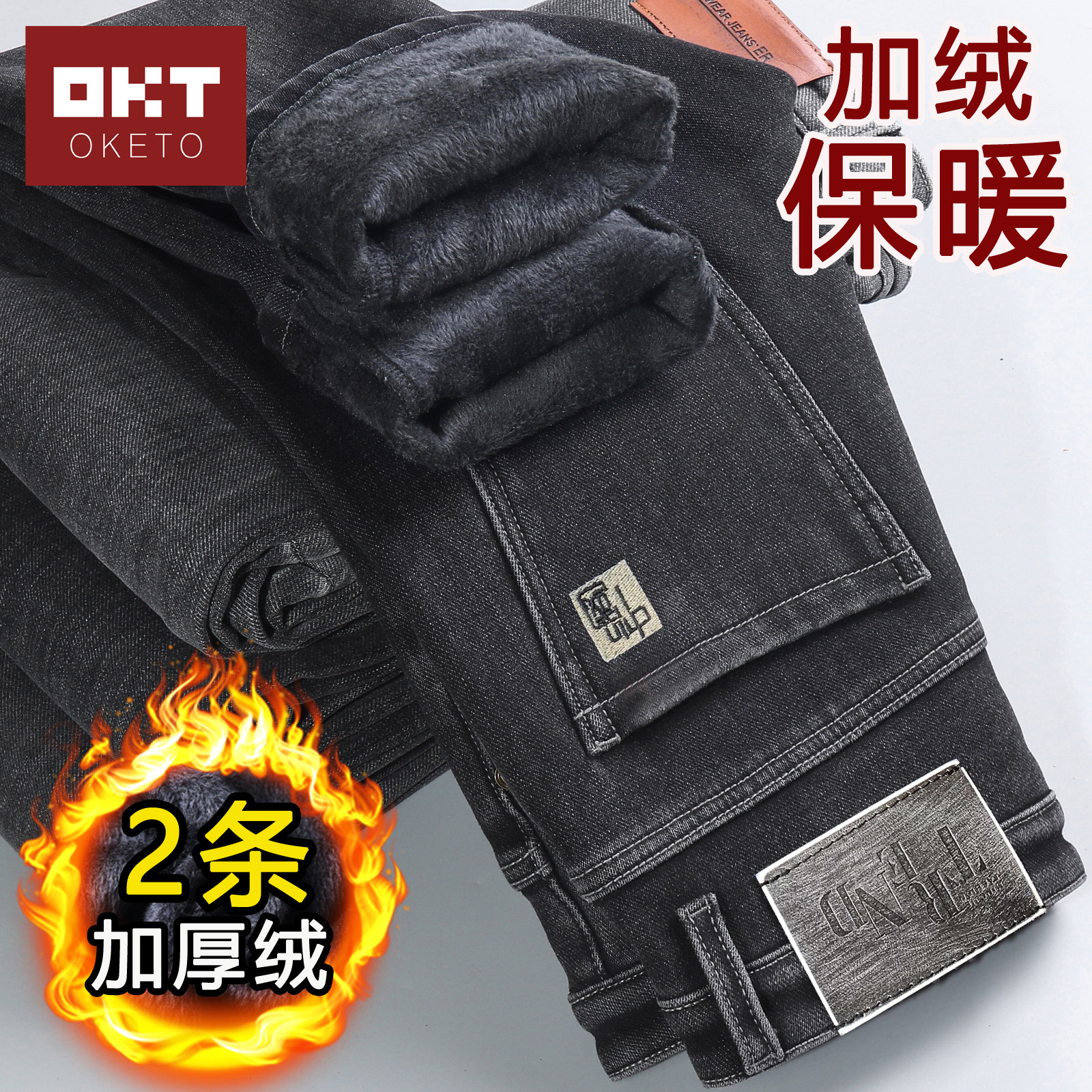富贵鸟加绒加厚牛仔裤男秋冬季直筒弹力商务保暖男裤中年爸爸长裤