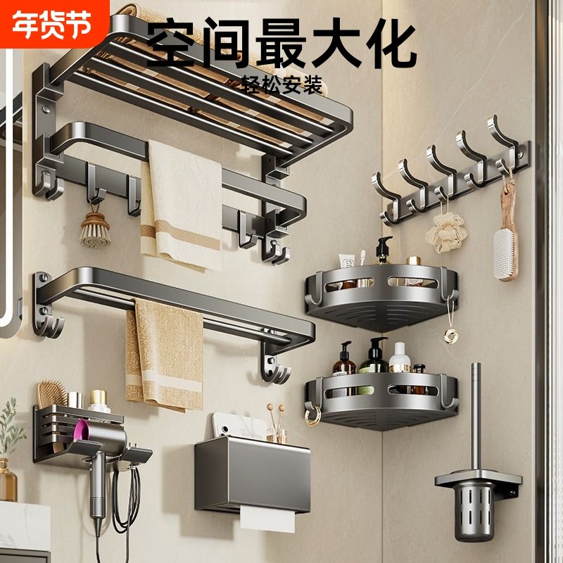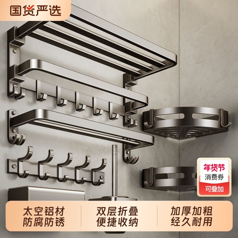 毛巾架免打孔卫生间置物架浴室太空铝折叠壁挂浴巾架收纳套装挂件