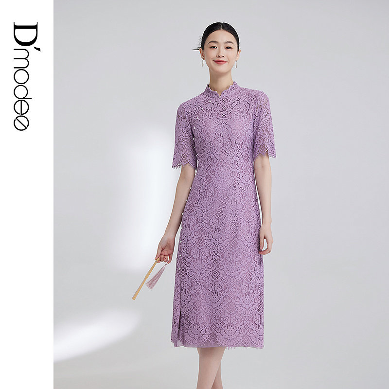 黛玛诗新中式改良旗袍春夏新款显瘦优雅蕾丝礼服连衣裙女紫色短袖