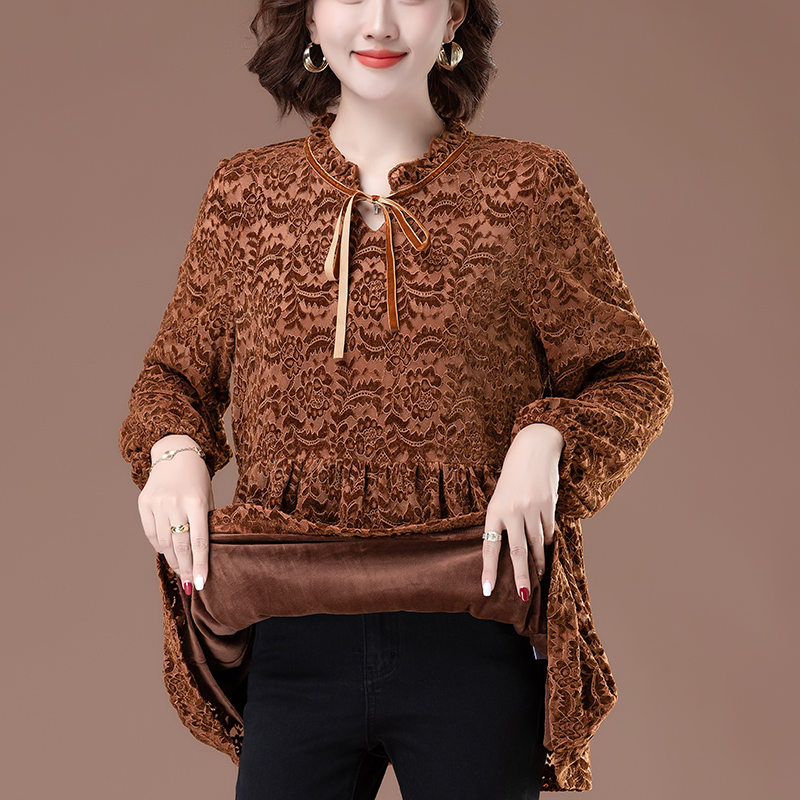 洋气中老年妈妈保暖蕾丝衫贵夫人中长款打底衫女宽松加绒长袖上衣