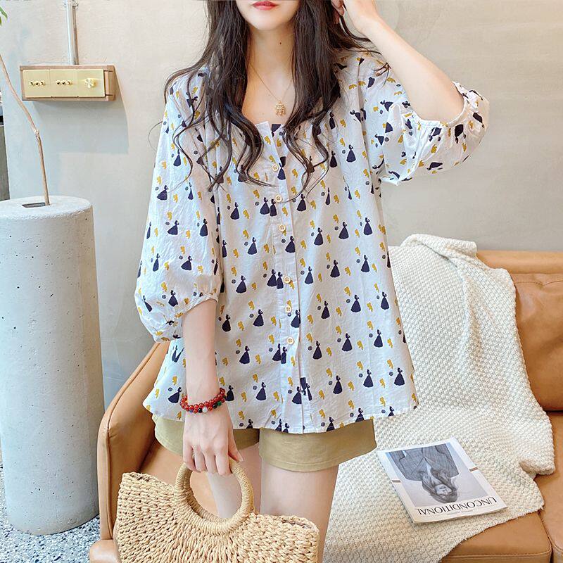 灯笼袖白色v领碎花衬衫女夏2025新款通勤韩版小衫宽松娃娃衫上衣
