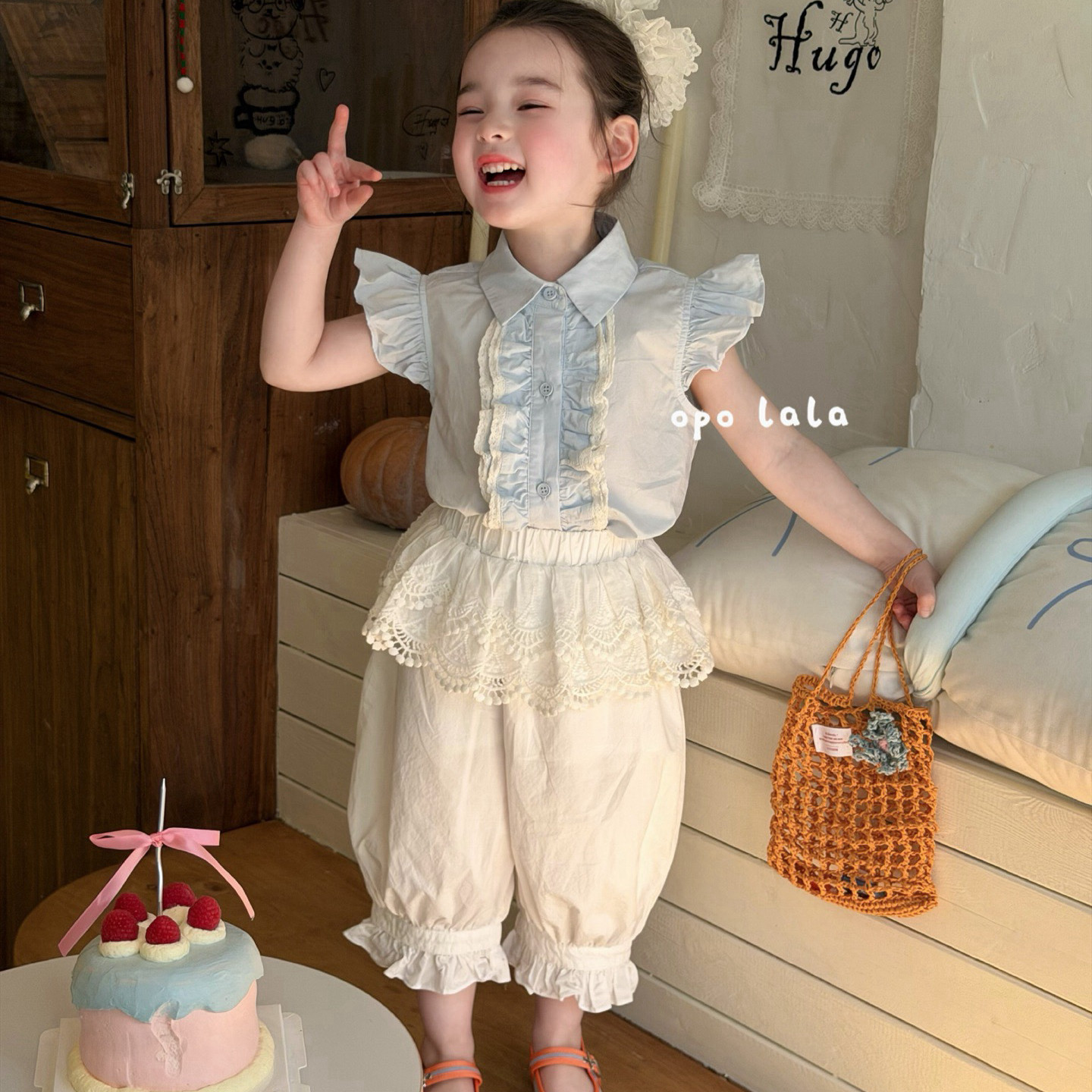 凡妈童装26夏新款女童小童韩版蕾丝花边棉布灯笼裤荷叶边飞袖衬衫