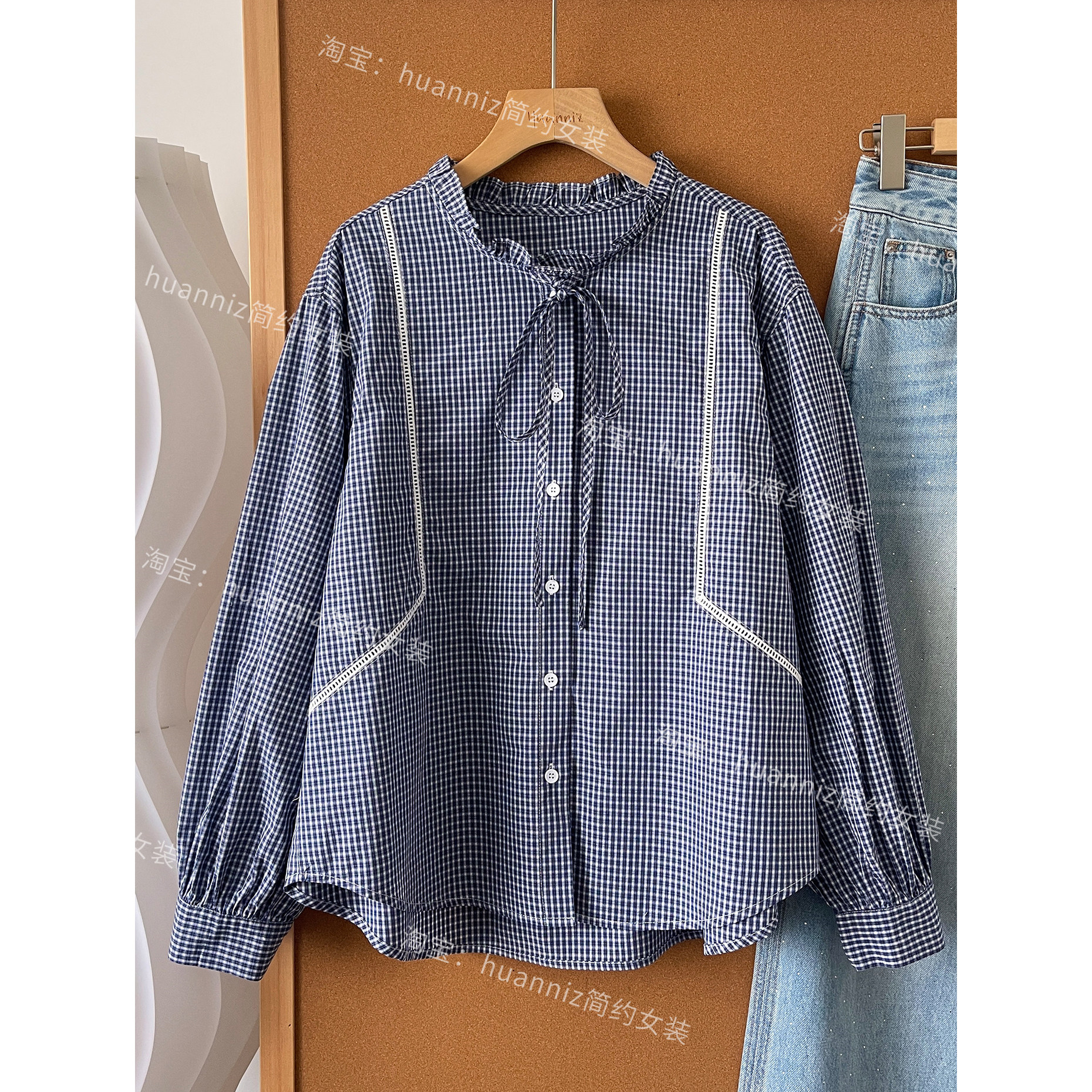 木耳边系带设计感纯棉镂空灯笼袖格子衬衫春季韩版遮肉宽松娃娃衫