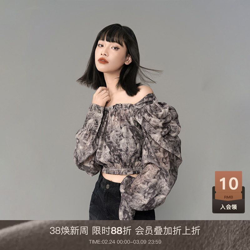 LOUZING韩版一字肩雪纺衬衫女小个子灯笼袖轻奢慵懒风印花上衣潮