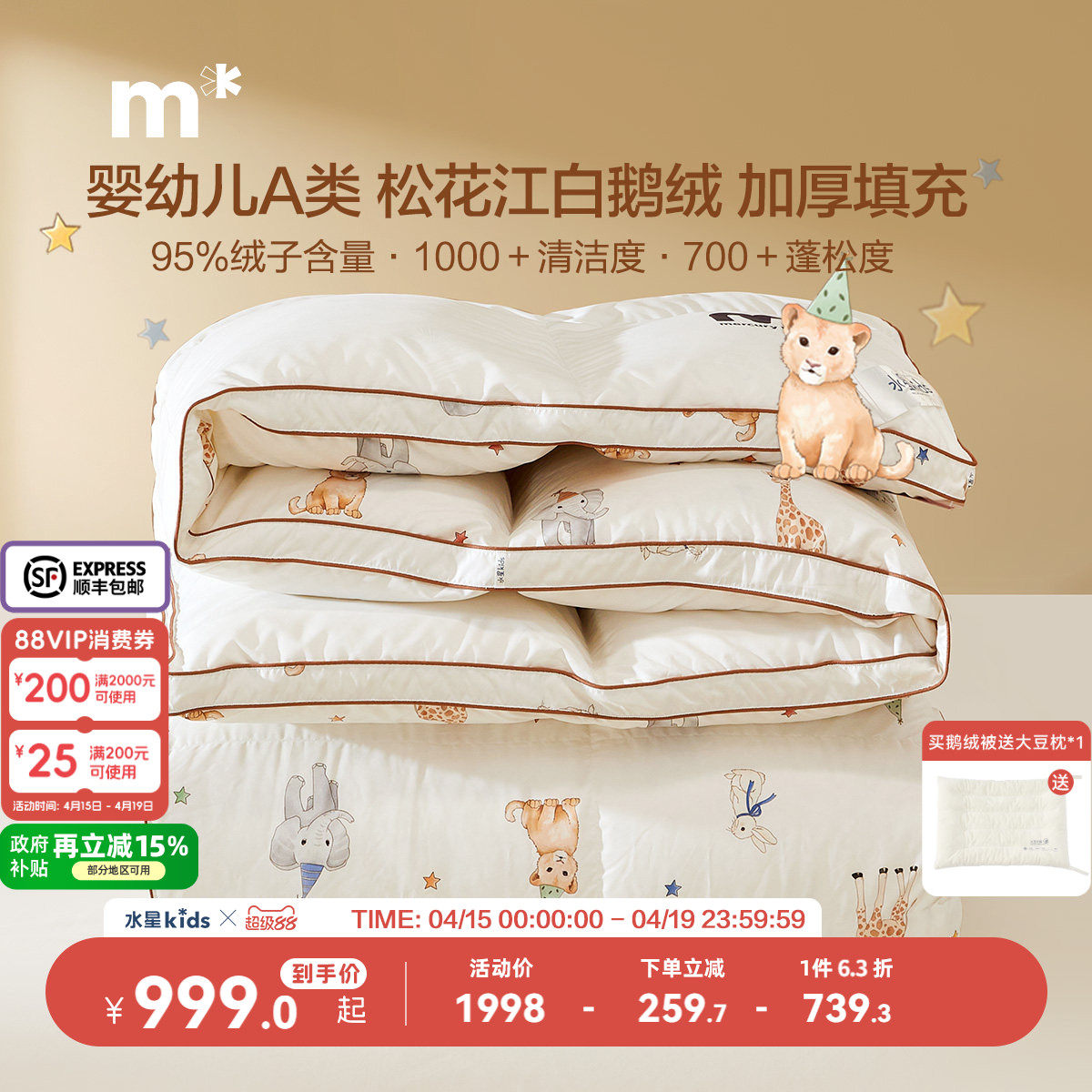水星儿童95白鹅绒被加厚羽绒被被子A类抑菌防螨可水洗白鸭绒被芯