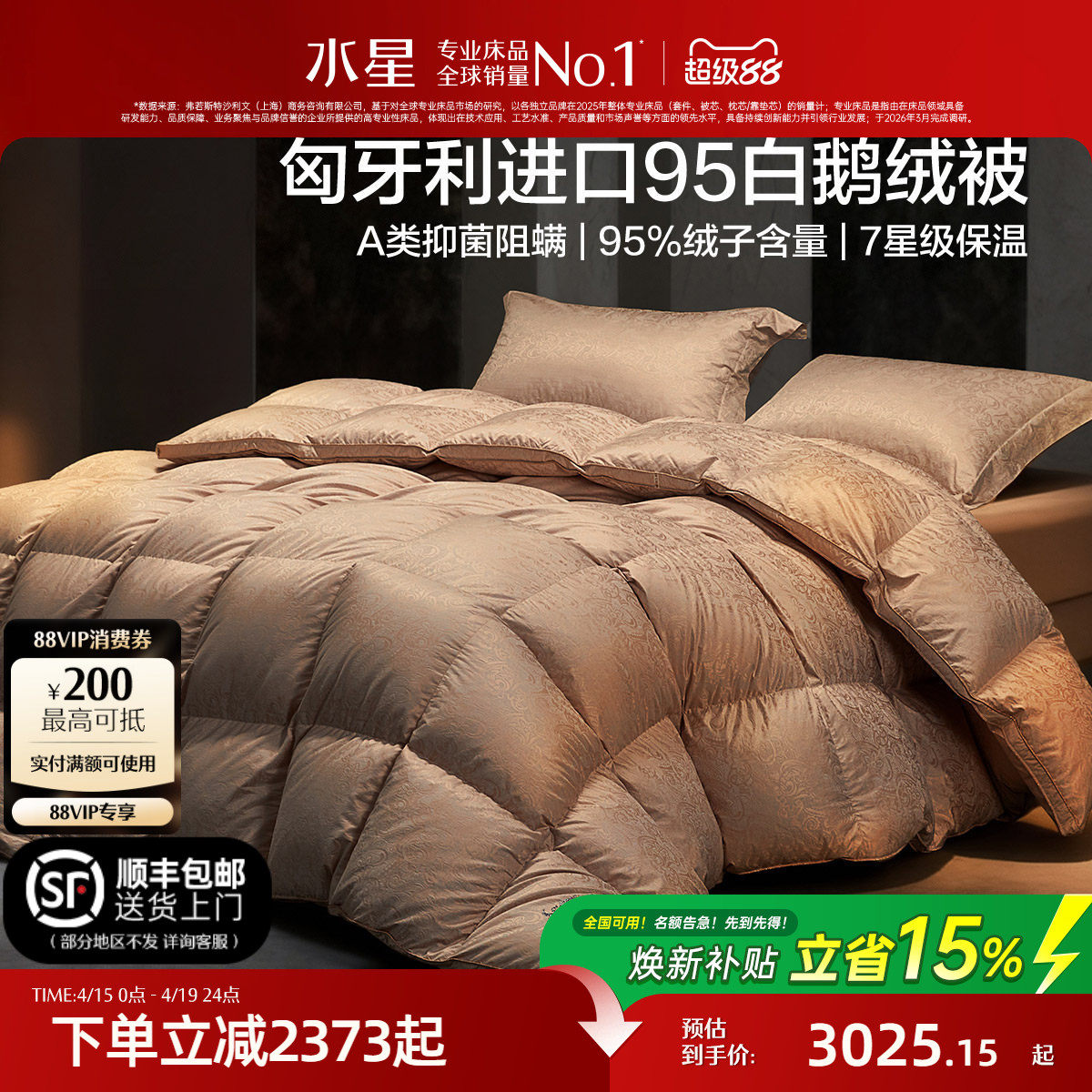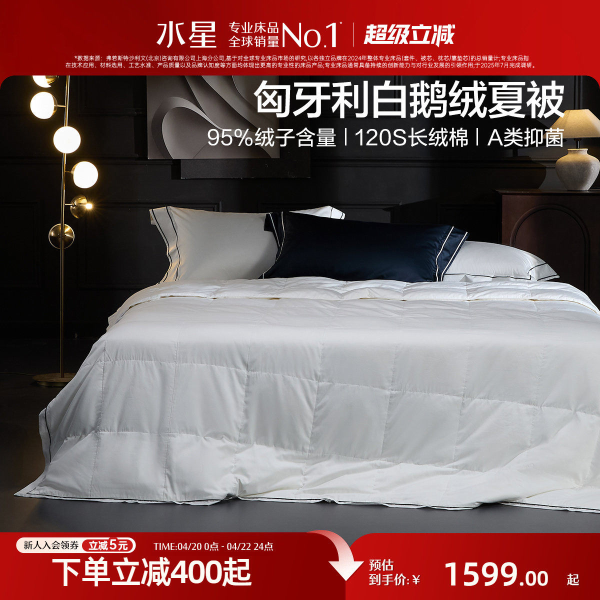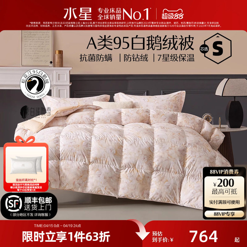 水星家纺进口羽绒被95白鹅绒春秋被120支长绒棉A类锁温被芯床品