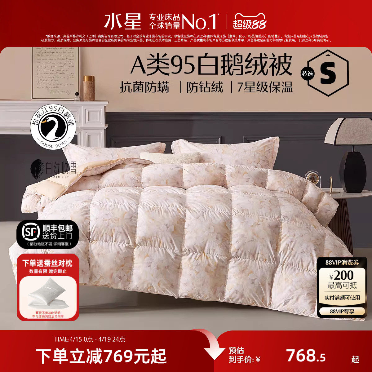 水星家纺95白鹅绒被子春秋被冬被抗菌被芯床品床上用品结婚庆喜被
