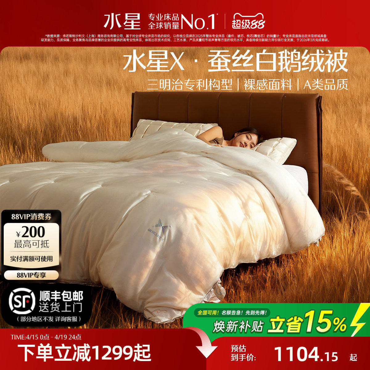 水星家纺95白鹅绒蚕丝被芯春秋被X被三明治被保暖床品青桑有机
