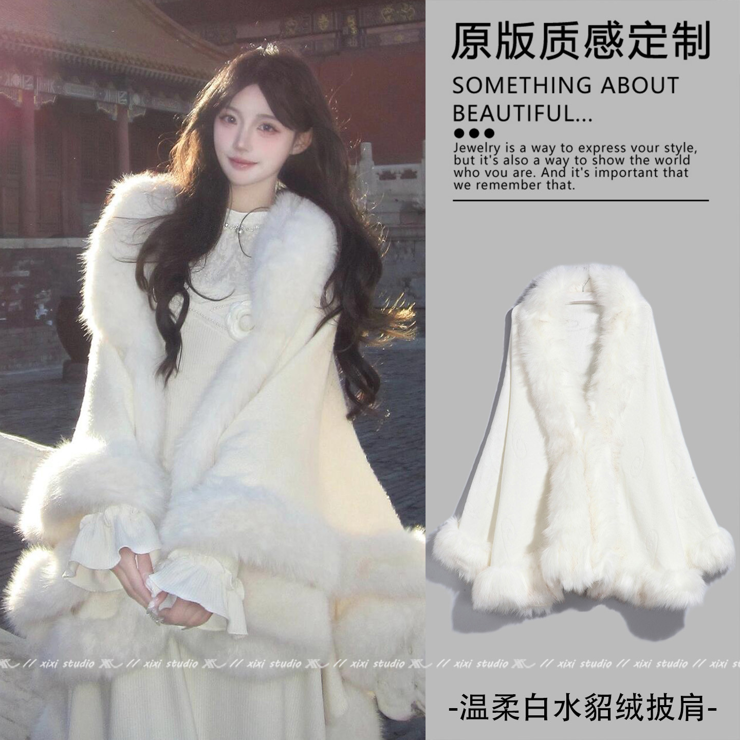 千金感仿皮草毛绒披肩米白色温柔长款针织斗篷2025新款外搭披风