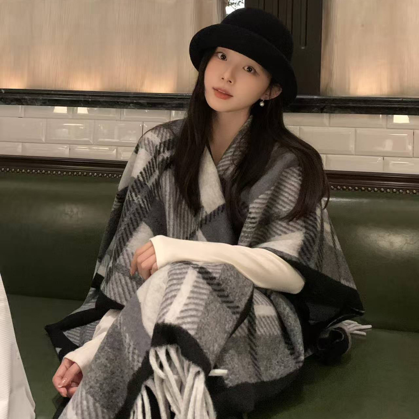 含羊毛复古格子纹针织围巾女秋冬韩系氛围感加厚斗篷黑白锁边围脖