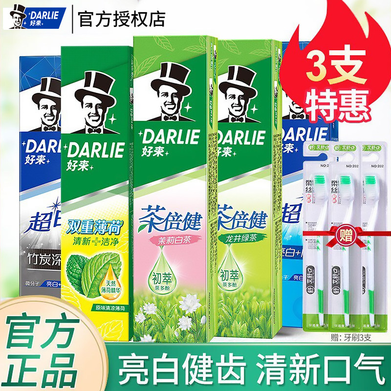 Darlie好来黑人牙膏超白茶倍健190g*3支家庭实惠装清新口气去牙渍