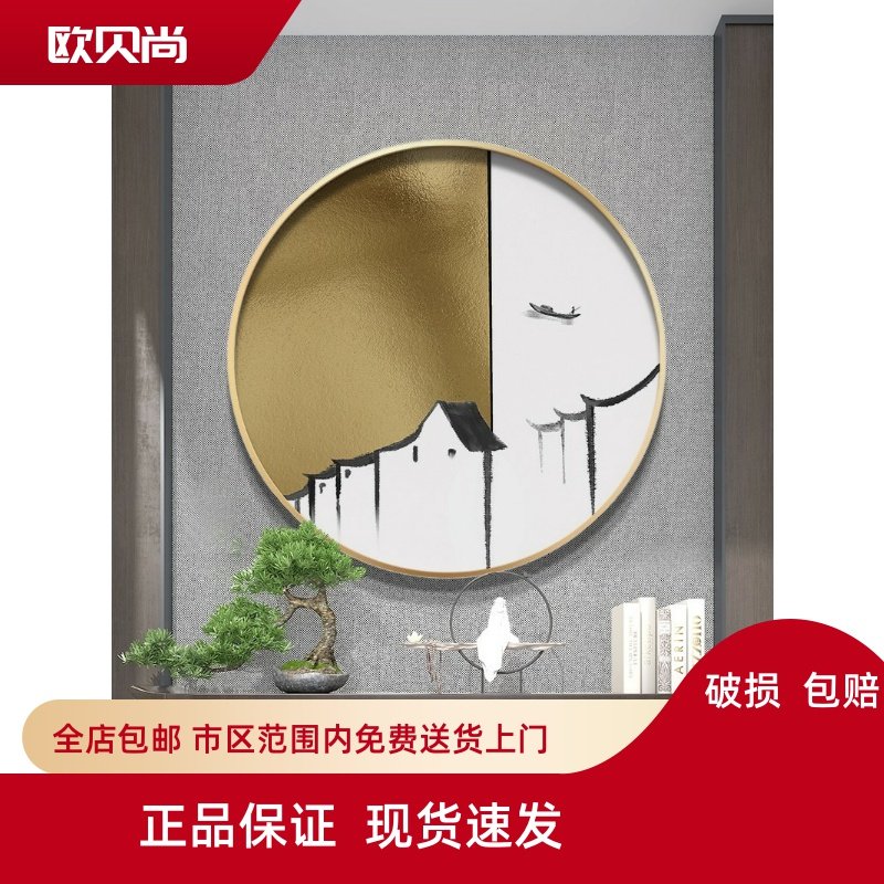 贴金箔水墨江南轻奢新中式样板房入户玄关过道走廊装饰画圆形挂画