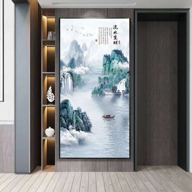 入户玄关山水画中式装饰画办公室挂画轻奢流水生财竖版走廊装饰画