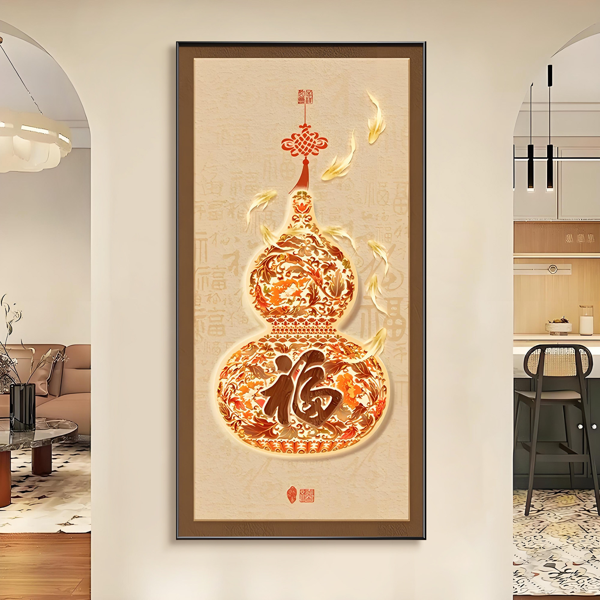 新中式平安福字入户玄关走廊装饰画葫芦喜庆卷轴画客厅背景墙挂画
