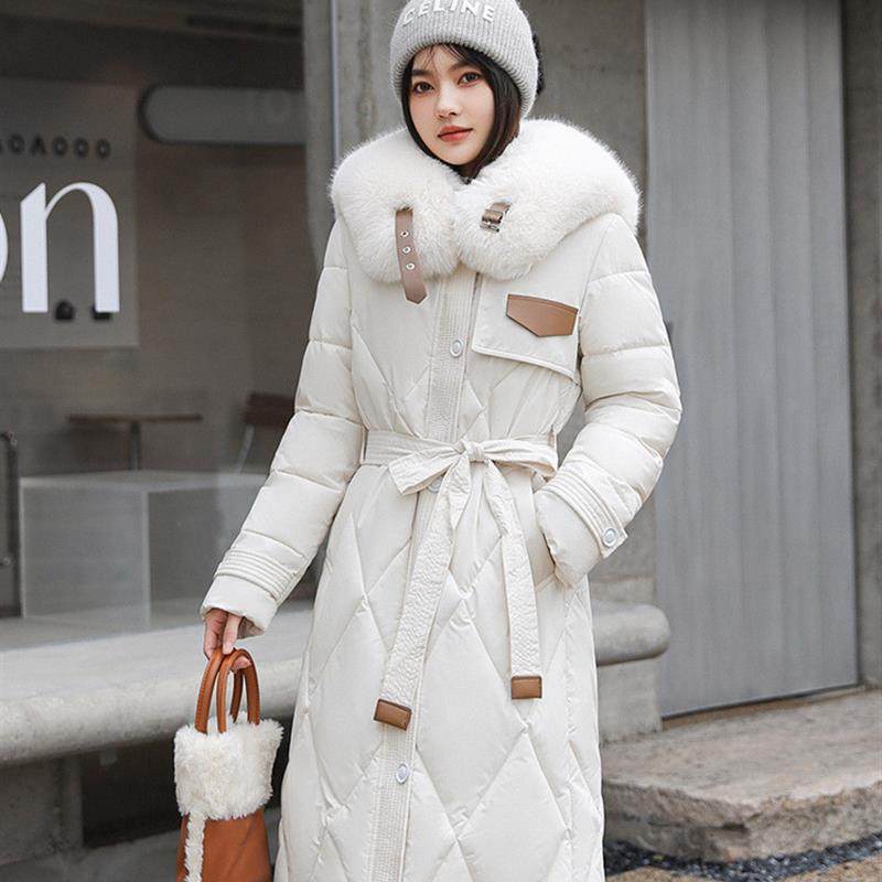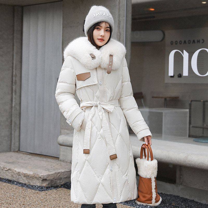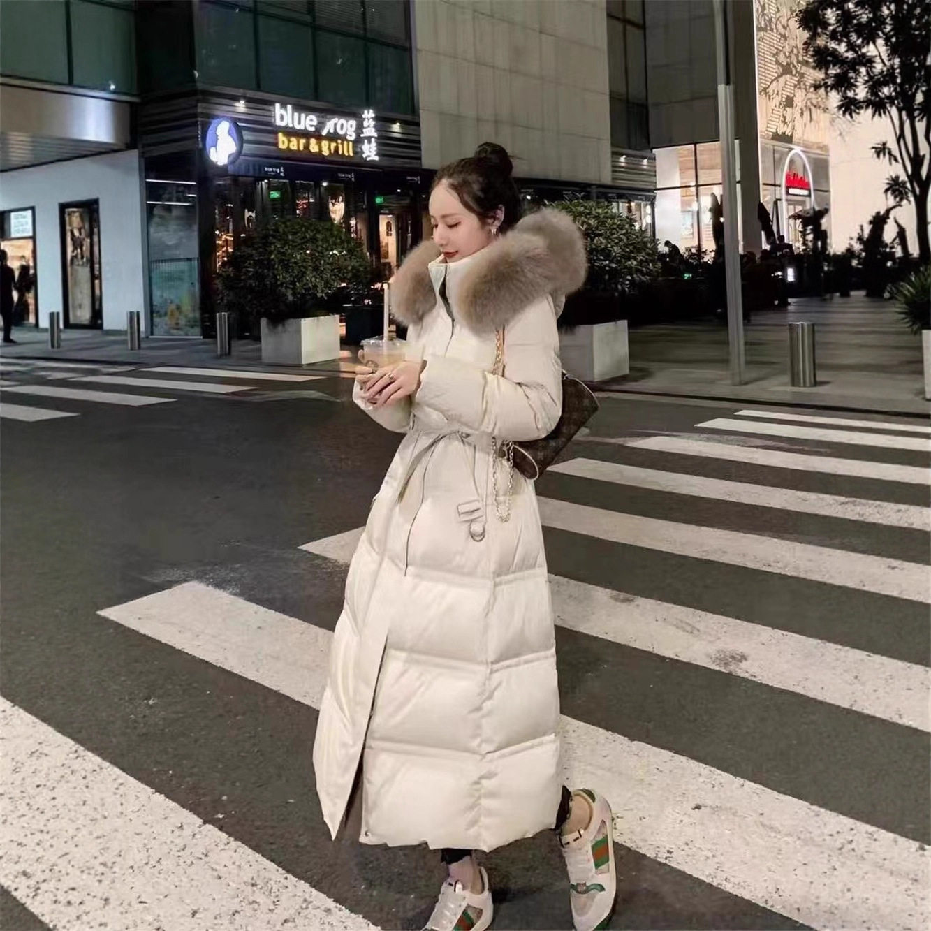 羽绒服2023年新款女冬欧洲站白鸭绒过膝中长款收腰连帽大毛领外套